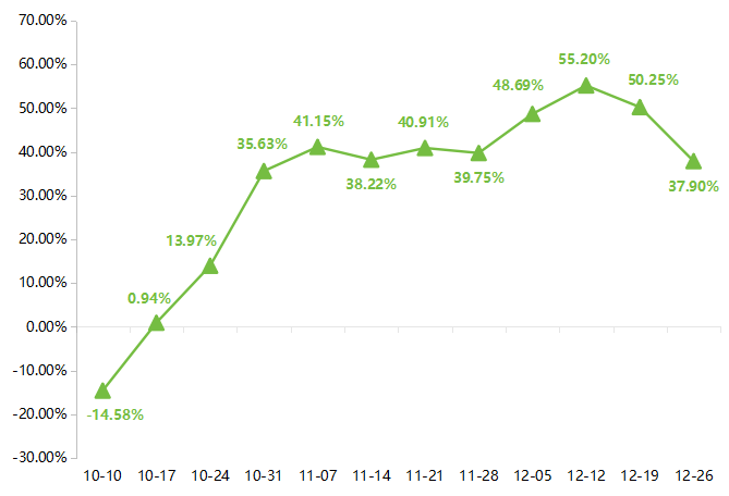 同比来看,本期蔬菜价格指数相较去年同期仍处于较高水平,本期同比升幅为37.90%。
