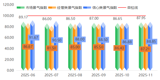 2025年11月,安国中药材市场景气指数结束10月微降态势,环比回升1.30个百分点至87.95点,虽仍低于100点荣枯线,处于不景气区间,但回升幅度为近5个月最大,市场筑底企稳信号进一步明确。其中,经营类景气指数、信心类景气指数同步改善,反映市场经营端活力边际增强、企业预期持续回暖。