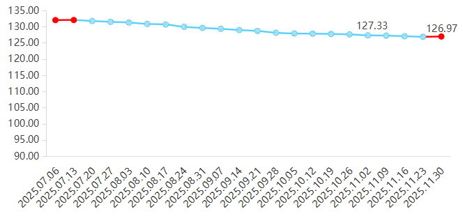 从周度走势看,指数从10月底的127.33点逐步跌至11月第三周的126.88点,其中11月第一周(11.02-11.09)环比跌幅仅为0.07%,为近8个月以来的单周最小跌幅,第二、三周指数环比跌幅分别为0.15%、0.13%,市场下行动能持续减弱,多空博弈趋于平衡。第四周,中药材价格指数回升至126.97点,环比上涨0.07%,为近5个月首次单周回升。主要受秋冬需求旺季拉动,麦冬、元胡、冬瓜子等品种备货需求增加,带动指数小幅反弹。