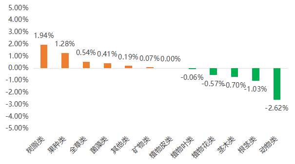 动物类(-2.62%):跌幅居首,水牛角(-25.71%)市场关注人气低落,并因缺乏实际需求,总体趋势显滑;九香虫(-11.93%)最近需求不旺,行情不及前期,市场全检合格货要价在1600元/公斤;海螵蛸(-10.38%)货源供应充足,市场走销缓慢,价格持续下跌;仅龙骨(+2.35%)、乌梢蛇(+0.41%)因货源偏紧,经营商家手中库存量不大,价格小幅上涨。