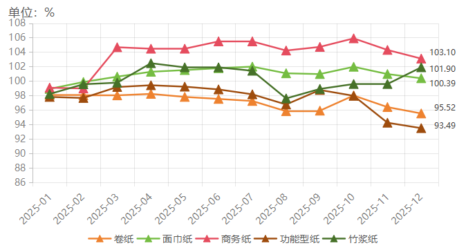 纸品方面,竹浆纸与其他纸品价格指数异向变动。2025年12月,纸品分项产品价格指数呈现“一升四降”态势,竹浆纸价格指数逆势而上,达到101.90点,较上月提升2.31个百分点;相比之下,卷纸、面巾纸、商务纸、功能型纸价格指数分别收报于95.52点、100.39点、103.10点、93.49点,较上月均有不同程度的下滑。