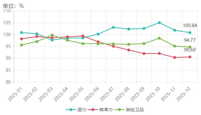 卫品方面,整体表现疲软,棉柔巾微幅回升。2025年12月卫品市场整体表现较弱,湿巾与其他卫品价格指数延续11月下行趋势,分别为100.84点、94.77点,较上月下跌1.05个百分点、0.40个百分点;棉柔巾价格指数则微幅回升0.21个百分点,达到90.60点,出现触底反弹迹象,但其长期趋势能否扭转仍需观察。
