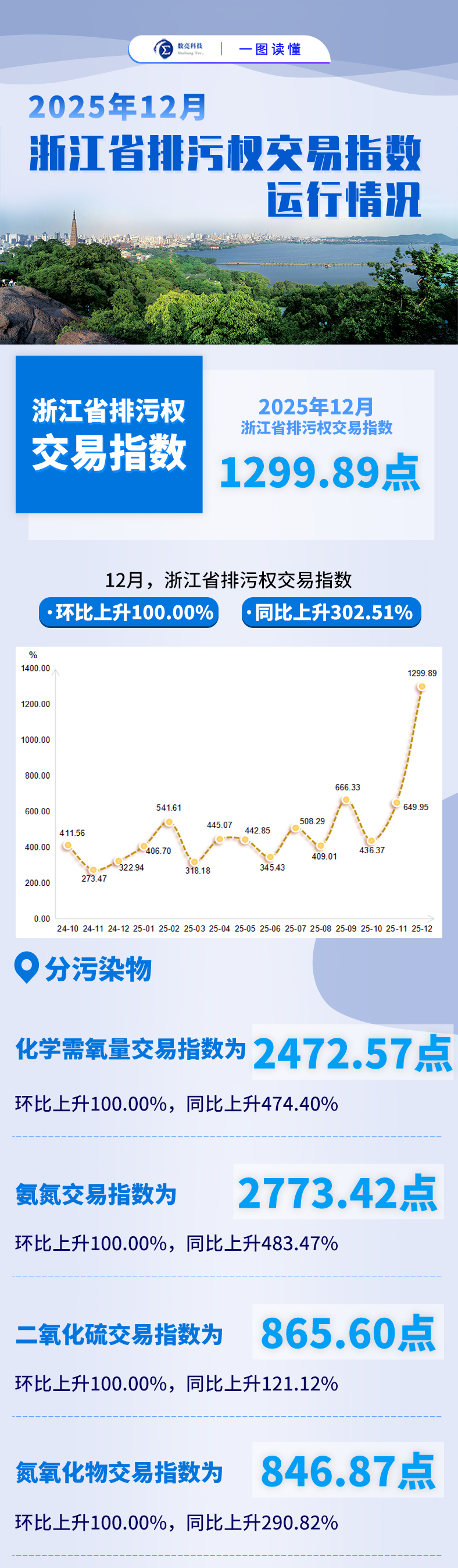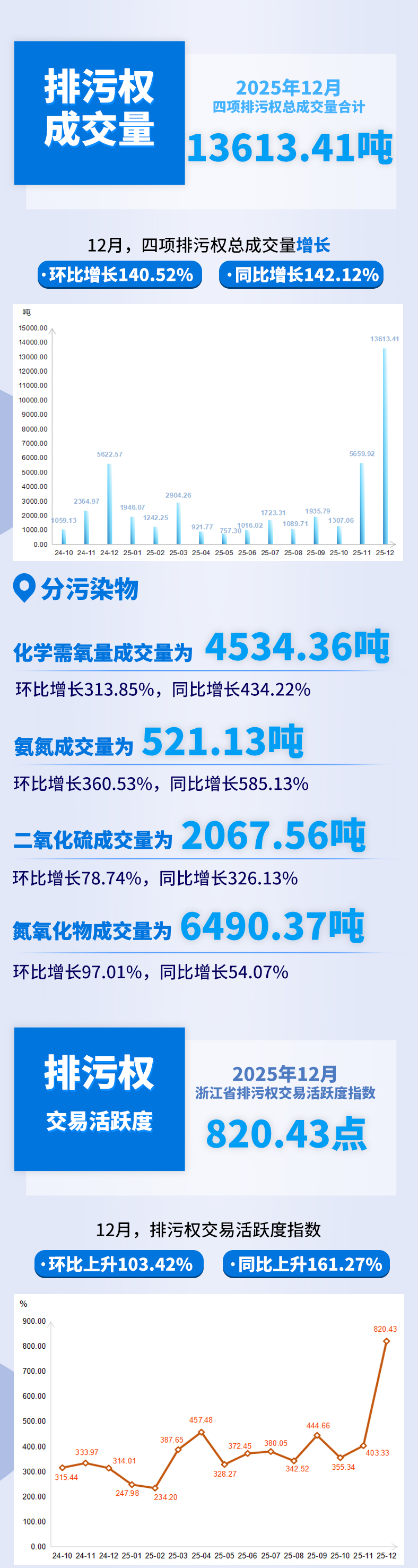 指数看点:2025年12月,浙江省排污权交易指数环比、同比均呈现上升态势。COD(化学需氧量)、NH3-N(氨氮)、SO2(二氧化硫)、NOx(氮氧化物)四种主要污染物交易指数环比、同比均有所上升,四项排污权总成交量环比、同比均实现增长。此外,浙江省排污权交易活跃度指数环比、同比同样保持上升态势。