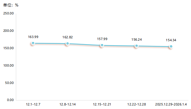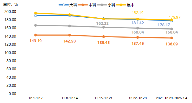 细分产品中,近两期兰炭各规格价格指数均有所下降,截至2026年第1周,大中小料、焦末价格指数分别收于178.17点、136.09点、158.04点和179.97点,环比降幅分别为1.79%、0.99%、1.25%和1.22%。