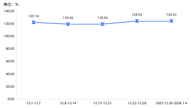 近两期,煤气价格指数涨后企稳,2025年12月最后一周指数收于124.33点,环比涨幅为4.17%,后持稳运行。