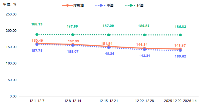 近两期,煤焦油价格指数分别收于146.34点、143.87点,2026年第1周指数降幅为1.69%。分析来看,近两期煤焦油价格持续下行,主要受供需失衡及产业链传导压力影响。一方面,兰炭企业开工率维持高位,煤焦油供应充足,而下游成品油市场低迷,加氢产品价格走弱,导致加氢企业对原料煤焦油的压价情绪加重;另一方面,兰炭企业面临高库存压力,出货意愿较强,进一步加剧价格下跌。尽管当前煤焦油价格已逼近阶段性低位,且兰炭企业亏损严重抑制了深跌空间,市场暂稳并出现小幅反弹迹象,但下游采购仍以刚需为主,成交量有限,短期市场预计以窄幅震荡为主。