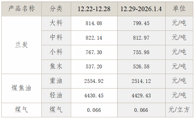 兰炭及其附属产品平均价格(2025.12.22-2026.1.4)