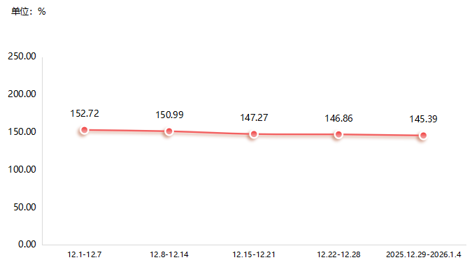 近两期(2025.12.22-12.28、2025.12.29-2026.1.4,下同),兰炭市场偏弱运行。据“神木·中国兰炭产业指数”信息系统监测,近两期兰炭产品价格总指数分别收于146.86点、145.39点,产品价格持续下滑。细分产品中,大中小料、焦末、重油和轻油价格指数延续下滑走势,煤气价格指数涨后企稳。