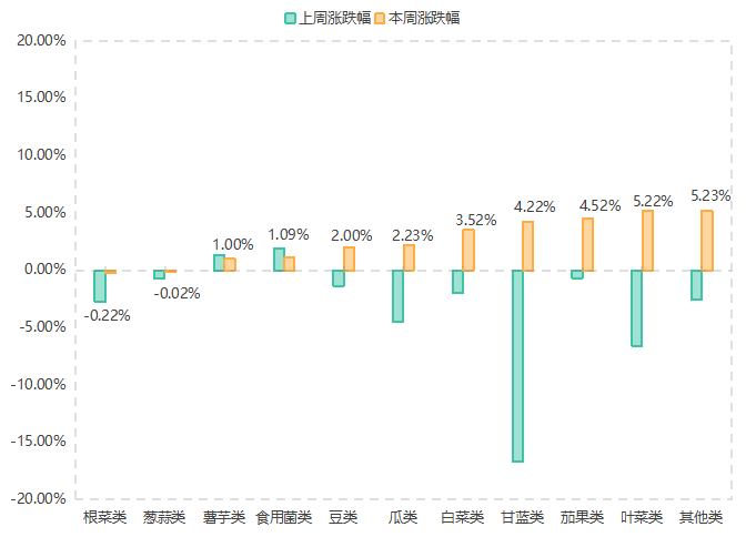 价格指数上升品类中:薯芋类(1.00%)、食用菌类(1.09%)蔬菜价格指数本期升幅有所收窄;豆类(2.00%)、瓜类(2.23%)、白菜类(3.52%)、甘蓝类(4.22%)、茄果类(4.52%)、叶菜类(5.22%)和其他类(5.23%)蔬菜价格指数本期均止降为升。