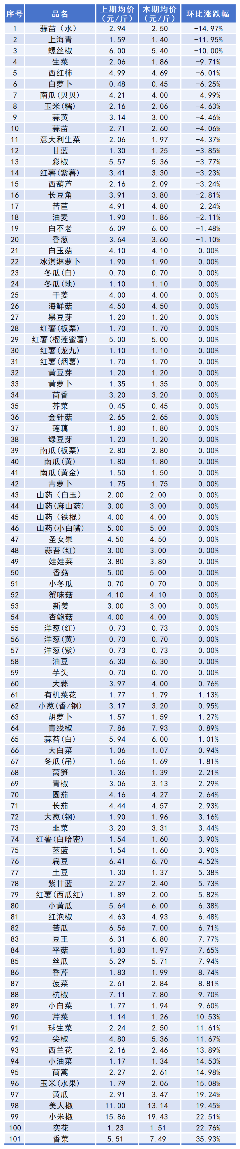 从具体蔬菜品种来看,本期价格上涨的蔬菜有42种,占总蔬菜品种41.58%,其中香菜本期均价7.49元/斤,上期均价5.51元/斤,环比涨幅达35.93%;价格下跌的蔬菜有20种,占总蔬菜品种19.80%,其中蒜苗(水)本期均价2.50元/斤,上期均价2.94元/斤,环比下降14.97%;本期价格持平的蔬菜有39种。