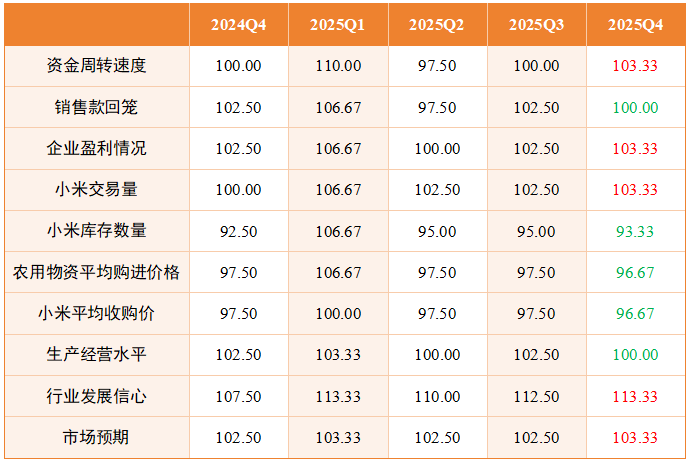 三季度,武安小米产业景气指数回升至101.50点;四季度虽小幅回落至101.33点,但整体运行已趋于平稳,展现出行业较强的抗波动能力。这一阶段的稳定态势,一方面源于“小米交易量”指标的持续稳健以及“销售款回笼”指标的明显改善,反映出市场实际需求对产业形成了有效支撑;另一方面,“行业发展信心”与“市场预期”两项信心类指标在整个下半年均维持在较高水平,成为景气指数企稳的重要压舱石。这充分表明,市场主体对武安小米产业的长期竞争力、品牌价值及未来市场前景依然抱有坚定信心,为产业高质量发展奠定了坚实基础。
