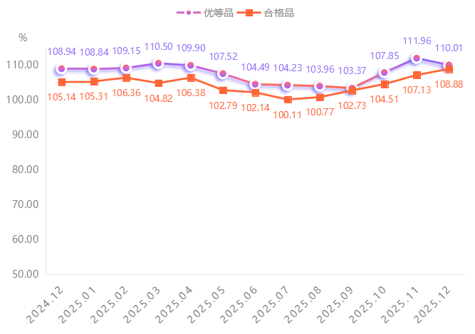 2025年12月,优等品小米价格指数收于110.01点,较2024年12月小幅上涨0.98%。这一态势主要得益于消费升级趋势下高端礼品市场、健康膳食理念普及以及深加工产业对优质原料的刚性采购需求。尤其在四季度新季小米上市后,其饱满的颗粒、醇厚的口感及稳定的品质获得市场广泛认可,进一步强化了优等品小米的价格溢价能力,支撑其在全年高位区间稳健运行。