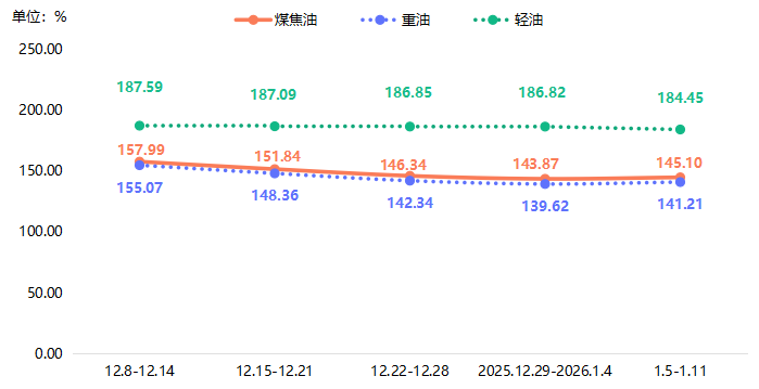 本期,煤焦油价格指数收报于145.10点,环比上涨0.85%。分析来看,本期煤焦油市场呈现止降回暖态势,主要驱动来自三方面:一是节前价格已触及低位区间,下游及贸易商采购意愿显著增强;二是当前兰炭企业普遍处于亏损状态,对煤焦油持挺价惜售心态;三是成本压力与心态支撑共同作用下,市场供需格局发生边际转变,带动煤焦油价格实现低位反弹。细分来看,重油价格指数由弱走强,本期指数环比上涨1.13%;轻油价格指数继续偏弱运行,环比下降1.26%。