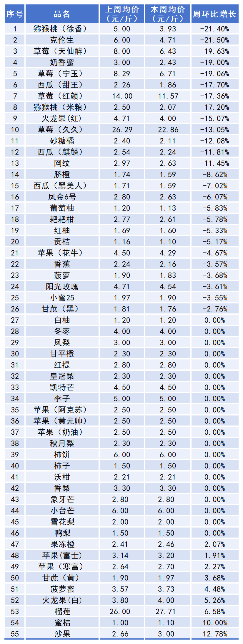 从具体水果品种来看,本期价格上涨的水果有9种,占总水果品种的16.36%,其中沙果本期均价3.00元/斤,上期均价2.66元/斤,环比涨幅达12.78%;价格下跌的水果有26种,占总水果品种的47.27%,其中猕猴桃(徐香)本期均价3.93元/斤,上期均价5.00元/斤,环比下降21.40%;本期价格持平的水果有20种。