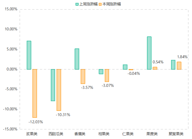 具体品类来看,本期七大类水果价格指数以下跌为主。其中,聚复果类和果蔗类水果价格指数相对坚挺,分别小幅上涨1.84%和0.54%;其余五类水果价格指数均有不同程度的下滑,跌幅较为明显的是浆果类(-12.03%)和西甜瓜类(-10.31%)。