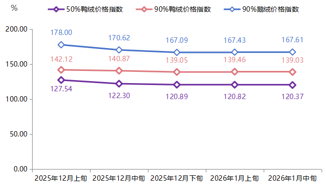 1月中旬,90%鹅绒价格指数逆势上行,收报于167.61点,环比上涨0.11%,凸显品质型消费在当前市场环境下的较强韧性;相比之下,90%鸭绒与50%鸭绒价格指数环比分别下降0.31%和0.37%,虽有不同程度回调,但仍维持在相对稳定区间,有效支撑大众市场对高性价比羽绒产品的旺盛需求,契合中产群体在消费理性化趋势下“高充绒、实保暖”的务实偏好。具体走势如下: