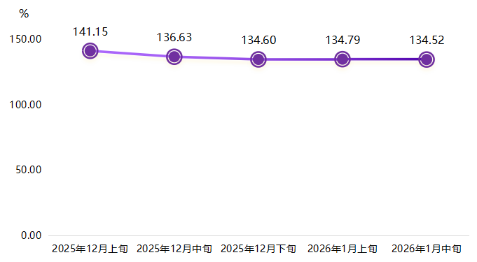 2026年1月中旬,受春节前需求分散与库存消化压力影响,指数进入短期调整阶段,羽绒服批发价格指数收报于134.52点,环比下降0.20%。具体走势如下: