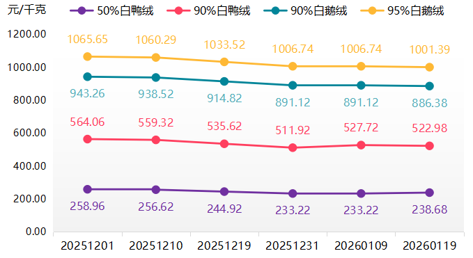 在生产端,市场呈现出大众刚需支撑力强于高端溢出需求的格局。截至2026年1月19日,50%白鸭绒、90%白鸭绒、90%白鹅绒、95%白鹅绒的价格分别为238.68、522.98、886.38、1001.39元/千克;其中,50%白鸭绒较1月9日上涨2.34%,90%白鸭绒、90%白鹅绒、95%白鹅绒较1月9日分别下降了0.90%、0.53%、0.53%。