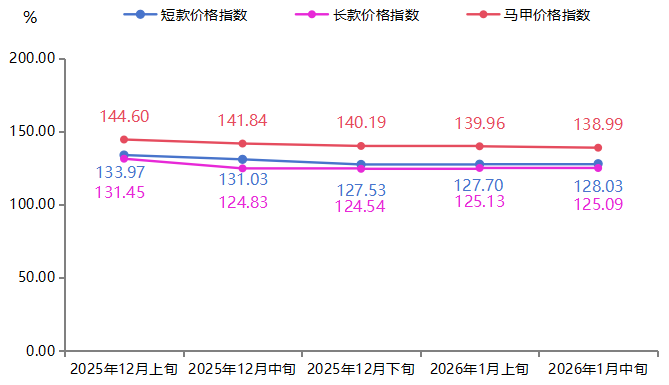 1月中旬,短款羽绒服价格指数收报于128.03点,环比上涨0.26%,得益于其轻便灵活、适配多变气候的实用性优势,在近期“忽冷忽热”的天气背景下,消费者更倾向于添置可应对温差变化的短款产品,返单需求持续释放;长款羽绒服价格指数环比下降0.03%至125.09点,当前需求已逐步进入平稳消化期,价格涨势暂歇;马甲价格指数则环比下降0.69%至138.99点,作为非核心保暖品类,在“务实保暖”为主导的消费环境下,其搭配属性难以支撑强劲动销,需求动能相对疲弱。具体走势如下:
