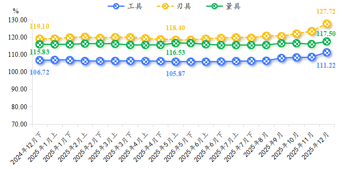 2025年,三类细分产品价格指数呈现“刃具领涨,工具与量具走势分化”的格局。