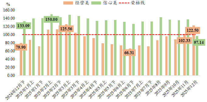 信心类景气指数全年保持较强韧性,整体基本稳定在荣枯线上方高位运行。即使在经营类指标深度收缩的二季度,信心指数仍维持在较高景气区间扩张运行,此种“信心强于经营”的格局,反映出企业对行业转型升级和长期发展抱有坚定乐观的积极预期。但值得关注的是,12月信心类景气指数小幅回落至97.14点,略低于荣枯线,主要受放假预期影响,企业陆续停工停产,属于短期性的信心波动。