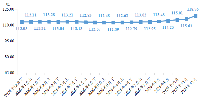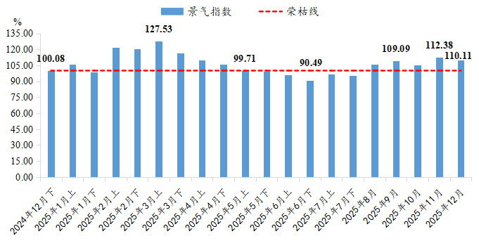 一季度,指数阶段性运行,受春节假期影响短暂收缩后,在复工预期及“以旧换新”政策刺激下快速回升至荣枯线上方,3月上达到年内高点127.53点。二季度,景气水平持续下降并跌入收缩区间,5月上指数降至99.71点,初步跌入收缩区间,6月下进一步探至90.49点的上半年低点。三季度起,景气指数开启回升通道,7月仍处收缩区间但已现回暖信号,8月成功重返扩张区间,9月进一步攀升至109.09点。四季度,指数走势小幅波动,但均稳定保持在扩张区间运行,表明整体市场景气度正在持续改善。