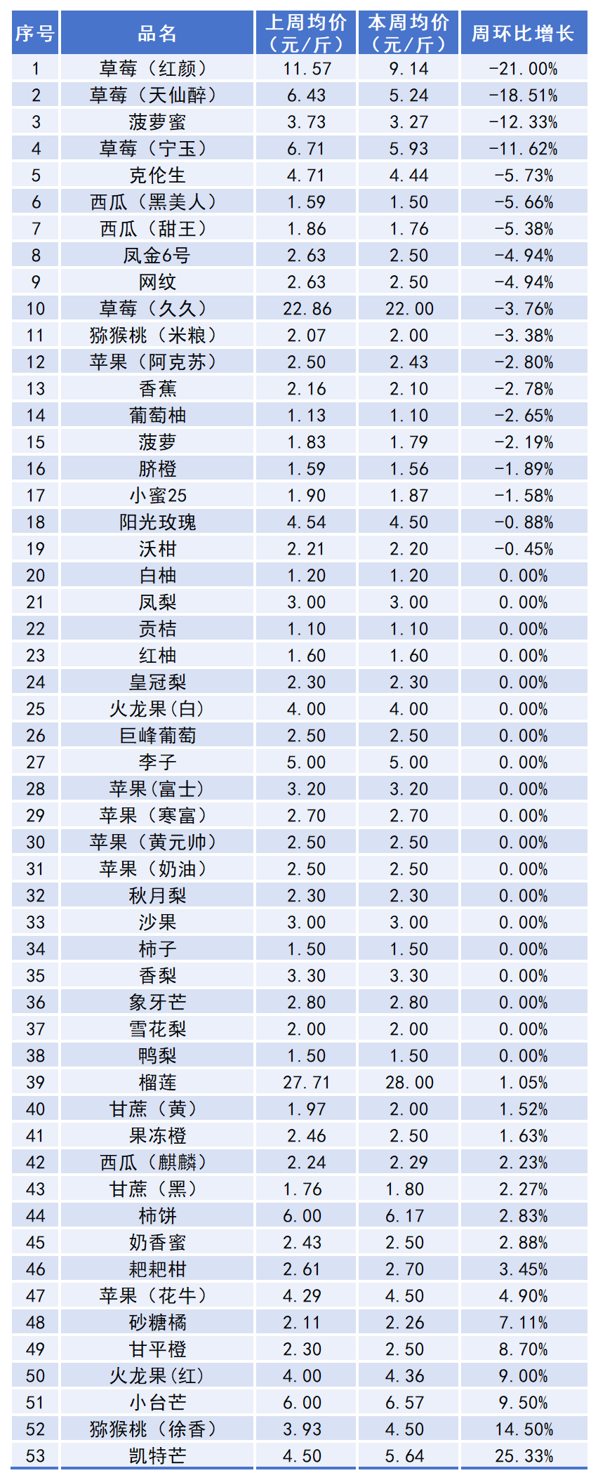 从具体水果品种来看,本期价格上涨的水果有15种,占总水果品种的28.30%,其中凯特芒本期均价5.64元/斤,上期均价4.50元/斤,环比涨幅达25.33%;价格下跌的水果有19种,占总水果品种的35.85%,其中草莓(红颜)本期均价9.14元/斤,上期均价11.57元/斤,环比下降21.00%;本期价格持平的水果有19种。