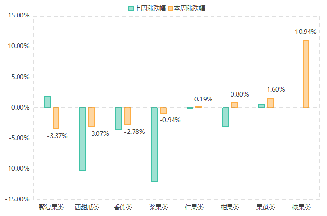 具体品类来看,聚复果类(-3.37%)水果价格指数本期由升转降;西甜瓜类(-3.07%)、香蕉类(-2.78%)以及浆果类(-0.94%)水果价格指数本期降幅均有不同程度的收窄;仁果类(0.19%)、柑果类(0.80%)水果价格指数本期止降为升;果蔗类水果价格指数本期升幅扩大至1.60%;核果类水果价格指数本期升幅为10.94%。