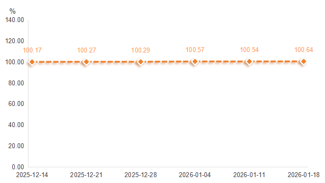 2026年1月第3周(1月12日—1月18日),通辽黄玉米产品价格指数收报于100.64点,环比上涨0.09%。指数具体运行情况如下图所示: