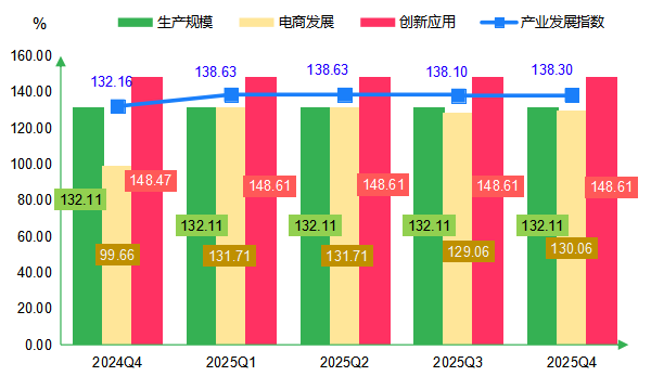 具体来看,生产规模和创新应用指数保持稳定,电商发展指数较2024年四季度小幅上升并全年企稳。2025年以来,徐闻菠萝产能扩张进入平台期,产业发展重心由“增量”转向“提质”,从外延式的“扩规模”转向内涵式的“提效益”。电商发展方面,徐闻地区积极探索网络营销,在鲜果上市高峰期,通过拼多多、天猫等平台直播带货、产地直供模式推动销量增长,线上渠道增长动能增强。