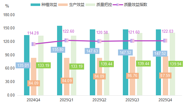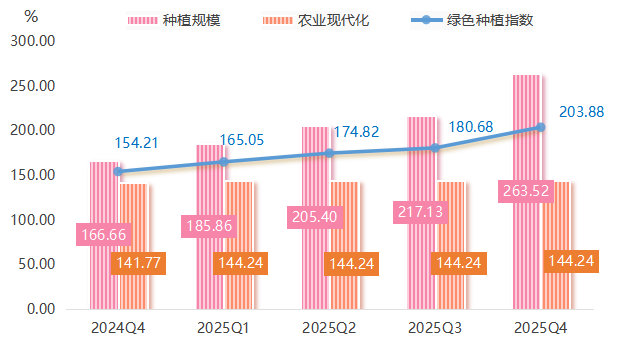 绿色种植指数的增长主要来自两方面的驱动。一方面,种植规模扩张提供了基础支撑。随着徐闻菠萝品牌知名度提升和市场需求增加,种植户扩大了种植面积以满足市场需求。2025年徐闻菠萝种植规模指数持续上涨,截至四季度,指数达到263.52点。另一方面,农业现代化技术的应用加速了绿色转型。徐闻地区全年通过大面积推广节水灌溉、测土配方施肥、病虫害绿色防控等现代农业技术,在显著降低农业面源污染的同时,实现了菠萝品质与单位面积产量的双提升。