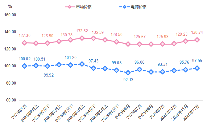 徐闻菠萝价格指数包括市场价格指数和电商价格指数。2025年度指数走势如下图所示: