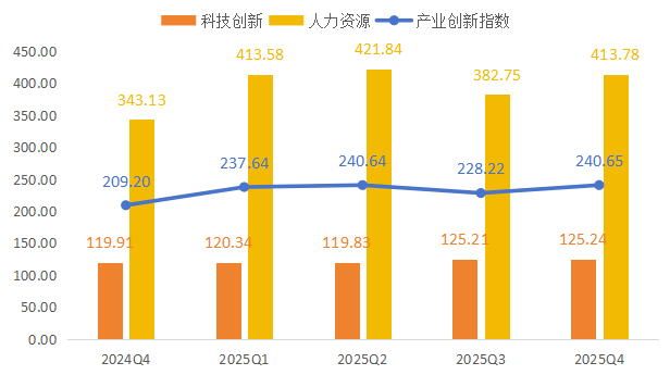 人力资源指数起伏明显。上半年,人力资源指数持续冲高,二季度达到年度最高点421.84点,三季度指数回调至382.75点,这也是导致当季度总指数下降的主要原因,四季度指数再次反弹至413.78点,显示出强大韧性。全年来看,人力资源指数的波动反映了产业人才引进、队伍建设或相关投入方面的阶段性变化,同时其整体高水平运行充分说明了人才要素在兰炭产业创新体系中的关键地位。