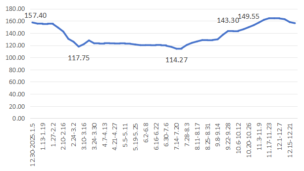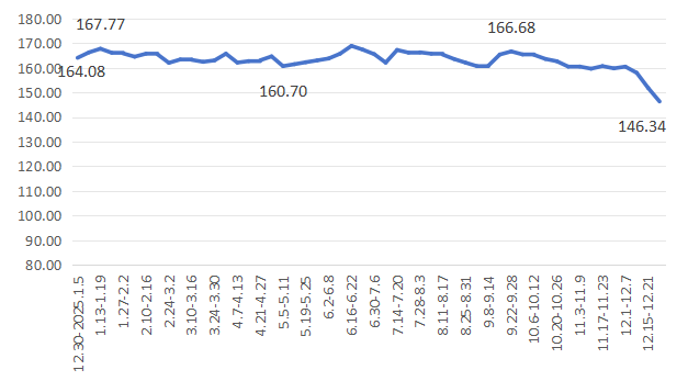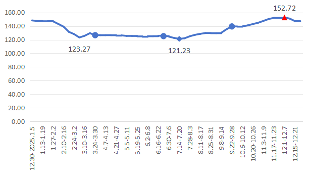 2025年神木兰炭价格指数呈现“先抑后扬”的整体走势。其中二季度为全年价格低谷期,四季度为价格高峰期,价格波动主要受季节需求、生产成本及市场供需关系影响。截至年末,指数收报于146.86点,具体如下: