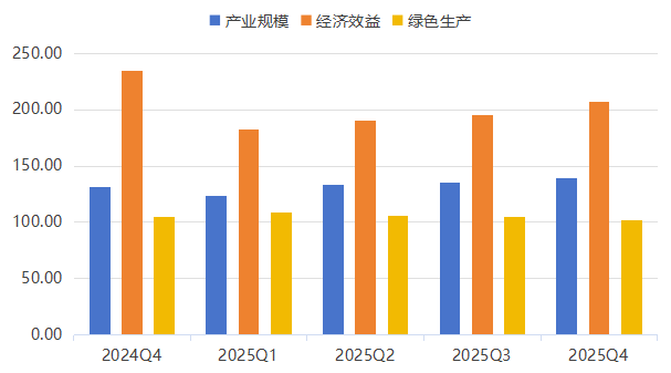 经济效益指数由第一季度的182.04点显著提升至第四季度的207.35点,增长13.90%,反映出兰炭产业在资源利用效率和经济效益方面的优化成效显著。产业规模指数也实现稳健增长,从123.10点上升至138.84点,增幅12.7%,说明产业规模在扩大的同时逐步与绿色发展要求相协调。然而,绿色生产指数全年表现相对疲软,且呈波动下行趋势,从第一季度的108.70点下降至第四季度的102.32点,降低5.87%,提示在生产过程中的资源消耗、污染排放等环节仍存在改进空间。