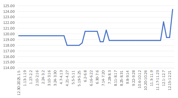 兰炭企业生产兰炭的副产品煤气大多自用,对外售卖较少,价格变动受企业自身定价影响,价格指数基本在固定区间波动。但2025年,由于兰炭等产品价格表现不及预期,对煤气价格挺价意愿有所增强,全年煤气价格指数整体表现上涨,截至2025年年末指数收于124.33点,较年初上涨3.89%。