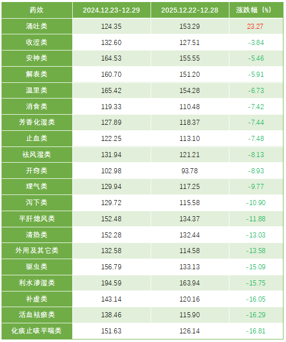 安国中药材按功效可分为止血类、清热类和化痰止咳平喘类等20个子类。2025年,功效指数仅涌吐类表现上涨,其余类别均有不同程度下跌,其中化痰止咳平喘类、活血袪瘀类、补虚类、利水渗湿类、驱虫类等五大类别跌幅超过15%。