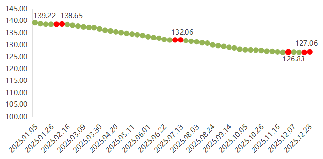 2025年安国中药材价格指数全年呈现持续缓跌、少数调整的运行格局,从2024年年末的139.81点逐步走低至2025年末的127.06点,跌幅达9.12%,超九成周度指数处于下跌通道,仅少数周度出现短暂上涨。