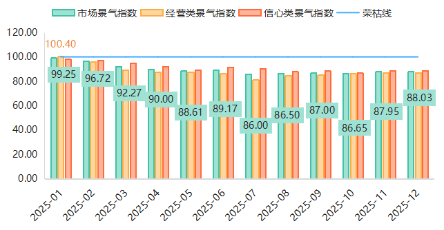 经营类景气指数:全年从1月的100.40点(唯一高于荣枯线的月份)波动下行至7月的81.50点(全年低点),年末回升至87.21点。1月受益于春节备货需求短暂破线,后续受春节闭市、产新冲击、库存积压等因素持续承压;7月因集中产新跌至谷底,8月后随着趁鲜切制政策落地、稀缺品种盈利修复及“金九银十”旺季拉动逐步回升;四季度依托秋冬滋补与节日备货需求延续复苏,但大宗品种库存高压限制涨幅。