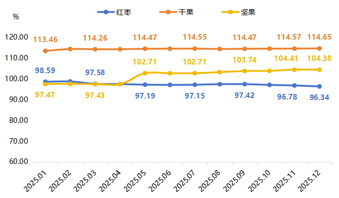 红枣及干果坚果产品价格指数下设红枣、干果、坚果三类产品价格指数,2025年三类产品价格指数走势如下图所示:
