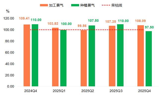产业景气指数下设加工景气指数和种植景气指数。2025年两类景气指数运行情况如下图所示: