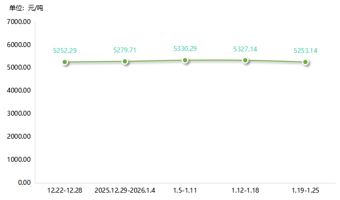 本期,硅铁市场均价为5253.14元/吨,环比下降1.39%。具体来看,近期硅铁市场稳中偏弱,价格呈小幅下行趋势,其主要压力来自供需矛盾冲突。供应方面,尽管主产区维持低负荷生产,但整体库存压力未减,且个别企业复产,产量小幅增加;需求方面,1月钢招临近尾声且定价重心下移,同时春节前钢厂季节性检修增多,后续需求预计减弱。硅铁价格的走弱与需求预期的转淡,反过来也进一步抑制对原料兰炭的采购积极性,兰炭在硅铁环节的需求支撑随之减弱。