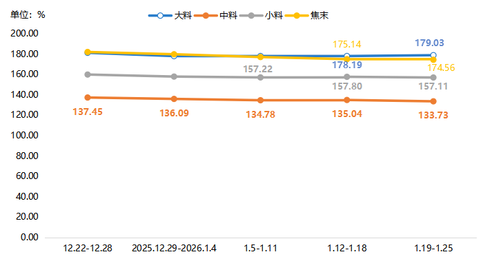 各细分产品价格指数呈“一升三降”。具体来看,大料价格上涨0.47%;中料、小料价格由涨转跌,环比分别下降0.97%、0.44%;焦末价格延续下滑走势,降幅为0.33%,较前期有所收窄。