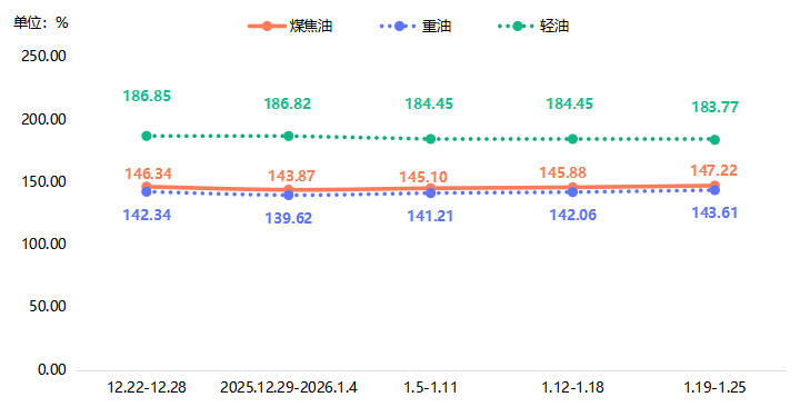 本期,煤焦油价格指数收报于147.22点,环比上涨0.92%。分析来看,近期煤焦油价格持续上涨,主要受以下两方面因素推动:一是下游需求旺盛,为市场提供了坚实的需求基础;二是在供需偏紧的格局下,企业挺价情绪高涨,推动成交重心上移。但受柴油价格持续走弱影响,下游对高位原料追涨趋于谨慎。因此,在强需求和强挺价下市场低位价格不断上移,但在柴油行情疲软的背景下,煤焦油价格短期内继续上涨的阻力仍然较大。