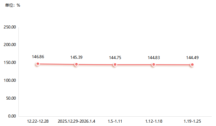 本期(2026.1.19-1.25,下同),神木兰炭市场偏弱运行。据“神木·中国兰炭产业指数”信息系统监测,本期兰炭产品价格总指数收于144.49点,环比略降0.23%。细分产品中,大料、重油价格指数上涨,煤气价格指数持平,中料、小料、焦末和轻油价格指数下降。