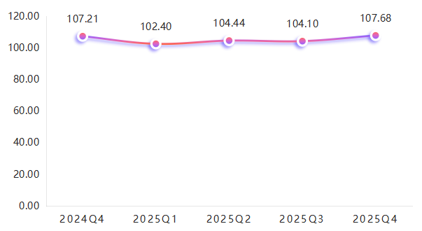 各季度涨跌原因清晰,呈现明显的季节性与产业发展规律:一季度受春节假期影响,企业开工率阶段性回落,产能释放不足,指数收于102.40点,为全年低点;二季度随着下游需求回暖,企业全面复工复产,开工率提升,产能充分释放,指数回升至104.44点,环比上涨1.99%;三季度受高温天气与部分工程施工放缓影响,下游采购需求小幅回落,指数小幅回落至104.10点;四季度受益于项目集中收尾、出口订单增长等因素,产能利用率达到全年高位,指数加速回升至107.68点,环比上涨3.44%,创下全年新高。