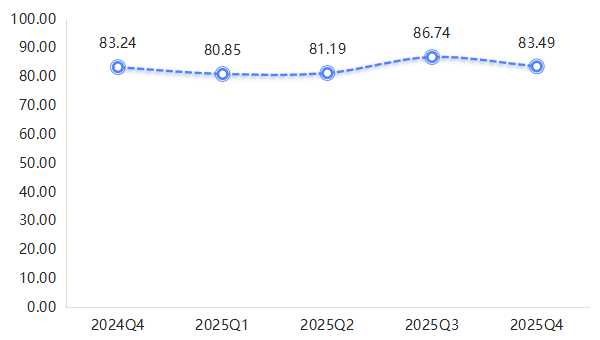 各季度指数涨跌波动与下游需求季节性、原材料成本波动高度相关。一季度受春节假期影响,企业产能利用率低、固定成本分摊高,经营效益不佳,指数处于全年低点;二季度需求回暖,企业产能释放,经营效益小幅改善,指数微升0.42%至81.19点;三季度需求旺季叠加原材料价格下行,规模效应显现,经营效益达到全年最优,指数冲高至86.74点,环比增幅6.84%;四季度需求收缩、原材料价格小幅反弹,经营效益小幅回落,指数小幅下降3.75%至83.49点。