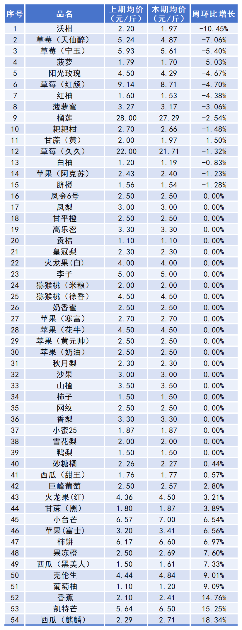 从具体水果品种来看,本期价格上涨的水果有15种,占总水果品种的27.78%,其中西瓜(麒麟)本期均价2.71元/斤,上期均价2.29元/斤,环比涨幅达18.34%;价格下跌的水果有15种,占总水果品种的27.78%,其中沃柑本期均价1.97元/斤,上期均价2.20元/斤,环比下降10.45%;本期价格持平的水果有24种。