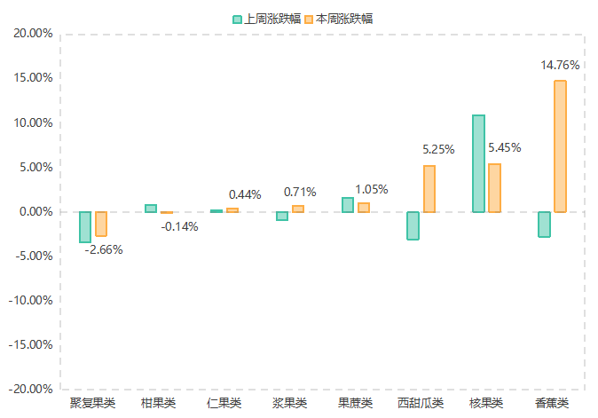 具体品类来看,聚复果类(-2.66%)水果价格指数本期降幅略有收窄;柑果类(-0.14%)水果价格指数则由升转降;仁果类(0.44%)水果价格指数本期升幅略有扩大;果蔗类核果类水果价格指数本期升幅则分别收窄至1.05%和5.45%;浆果类(0.71%)、西甜瓜类(5.25%)香蕉类(14.76%)水果价格指数本期均止降为升。