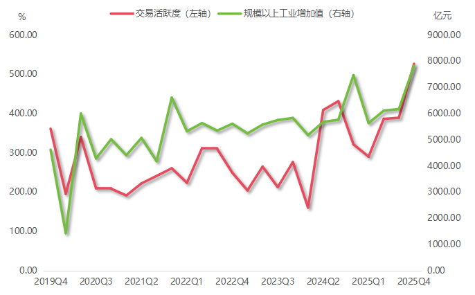 从工业经济指标来看,浙江省排污权交易活跃度与工业增加值(采用浙江省规模以上工业增加值各季度增加值,非累计数)整体呈中度正相关走势,显著性水平小于0.01,皮尔逊相关系数为0.735。